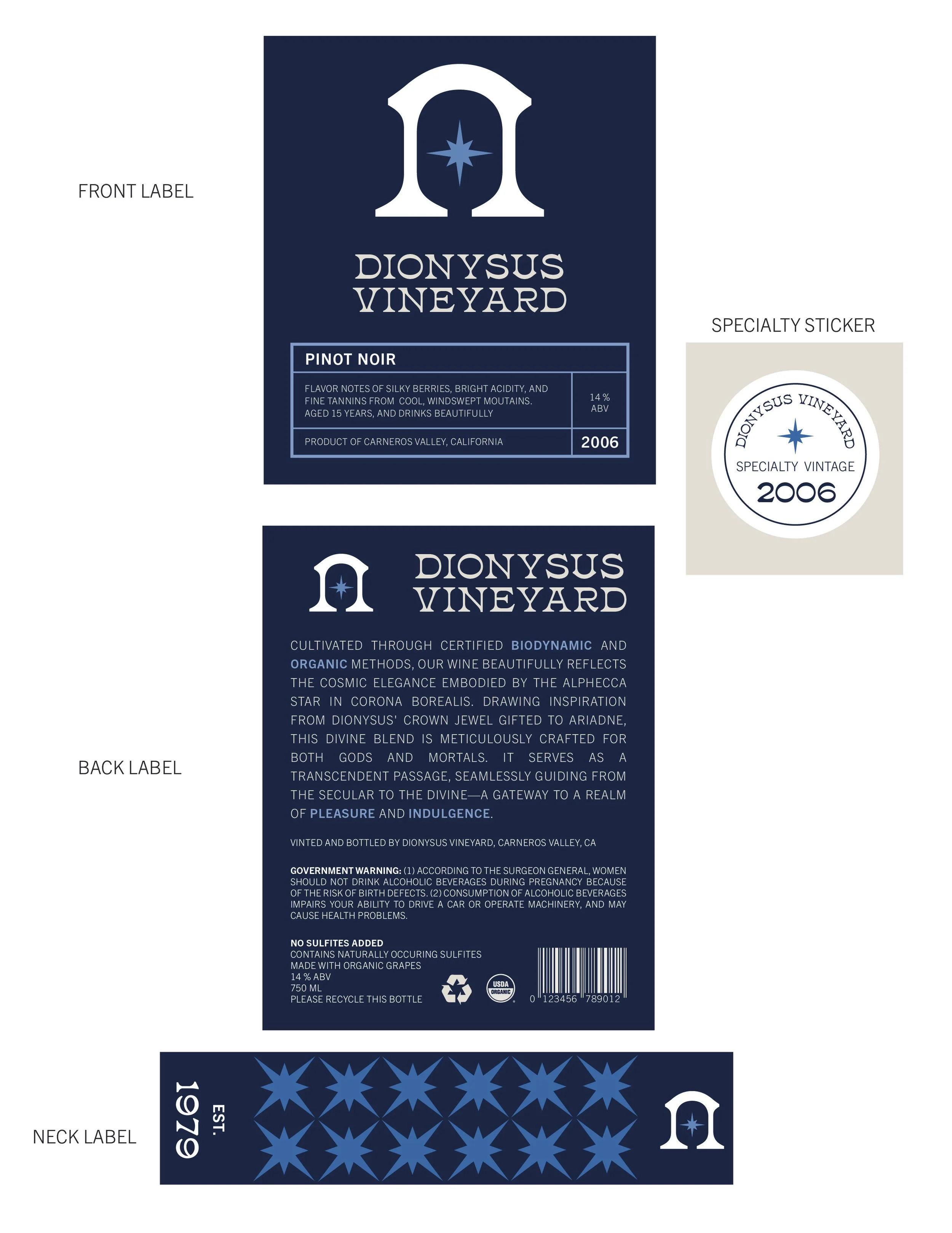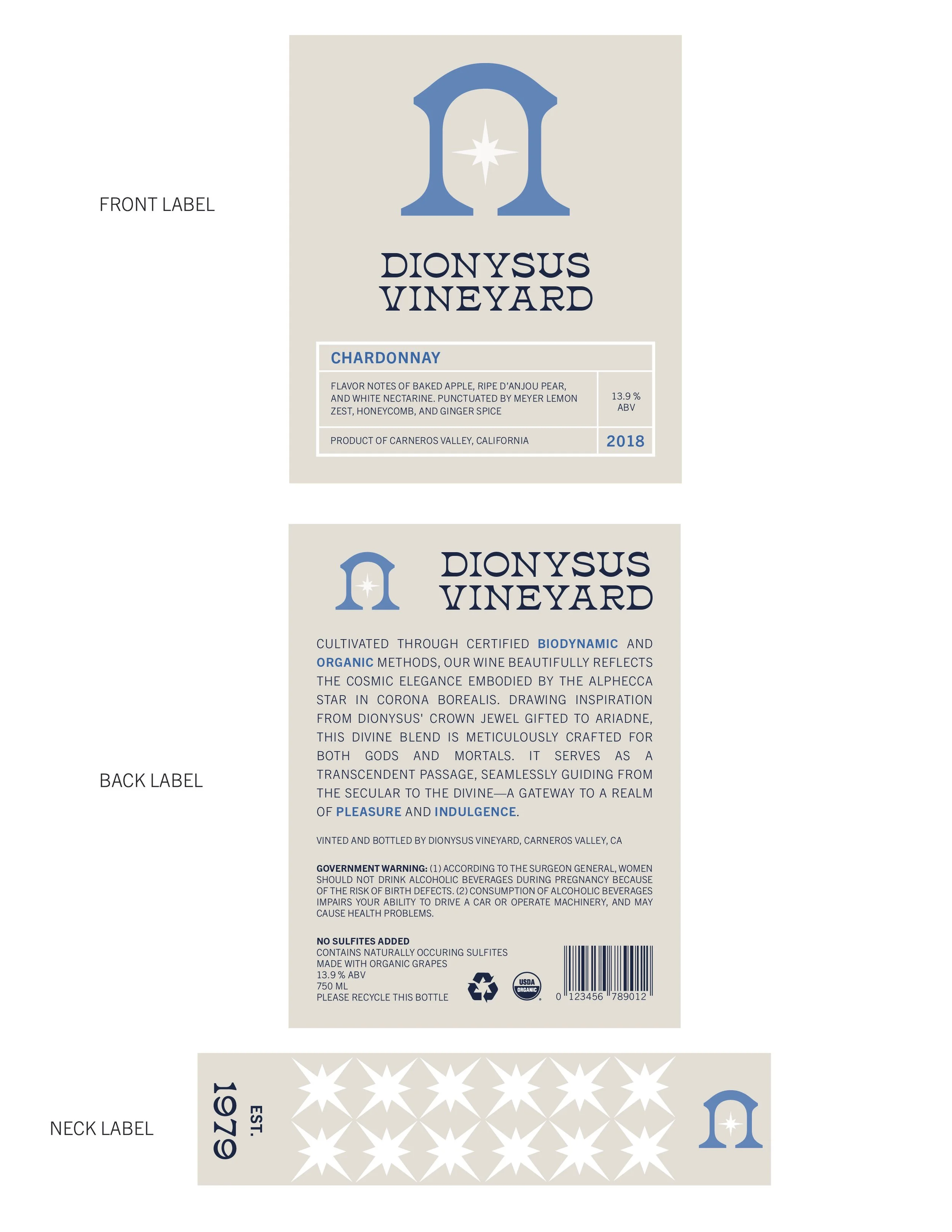 For my Corporate Identity class at Columbia College, I designed wine labels for Dionysus Vineyard, a fictional winery committed to biodynamic, organic, and sustainable farming. My eco-friendly design reflects these values, featuring a Greek archway symbolizing the journey from the secular to the divine, and the Alphecca star from the Corona Borealis constellation—tying into Dionysus' mythological story.
